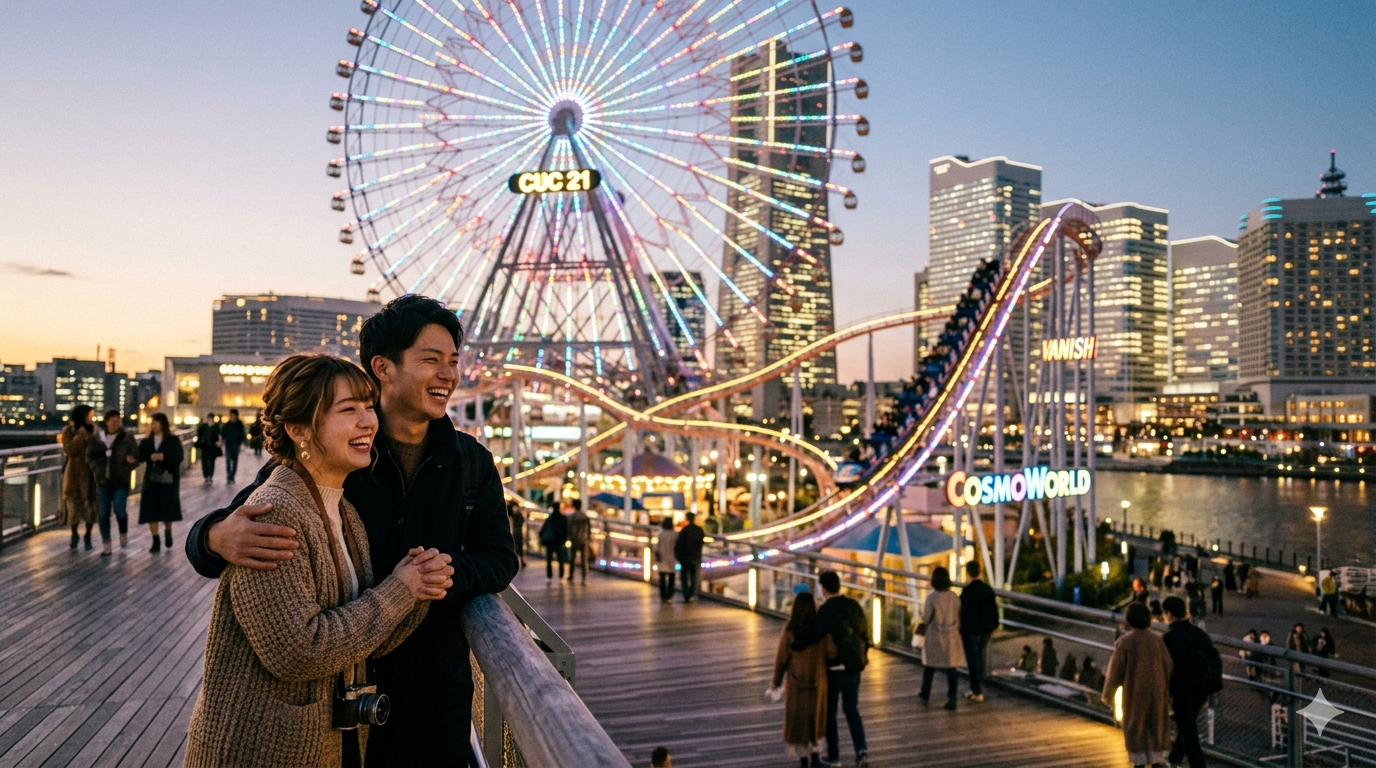 夕方からみなとみらいを散策し、日没前にジェットコースター、日が落ちた後に観覧車へ乗る流れは非常に人気があります。